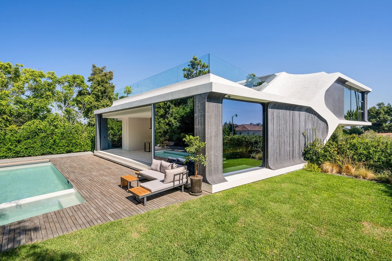 An eco-conscious pavilion showcasing Smart Home features like led lighting and shades, Whole Home Networking and architectural design. remote monitoring security system with high-definition cameras all wrapped.
